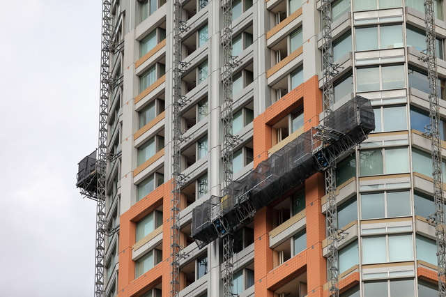 吊りチェーンやパイプ、金具、作業床などを用いて上から吊り上げる形で設置する「吊り足場」の施工も行っています。吊り足場は、高所作業が必要な現場や地面の形状により通常の足場が設置できない場所で特に活躍します。限られたスペースでも設置可能で、高所での横方向の作業を効率よく行うことができるのが特徴です。地面の影響を受けないため、広範囲にわたる作業も安全かつスムーズに進められます。桜建Groupは、吊り足場の特性を最大限に活かし、安全性と作業効率を両立させた施工を提供。住宅や商業施設、大規模施設など、さまざまな現場で柔軟に対応しています。
